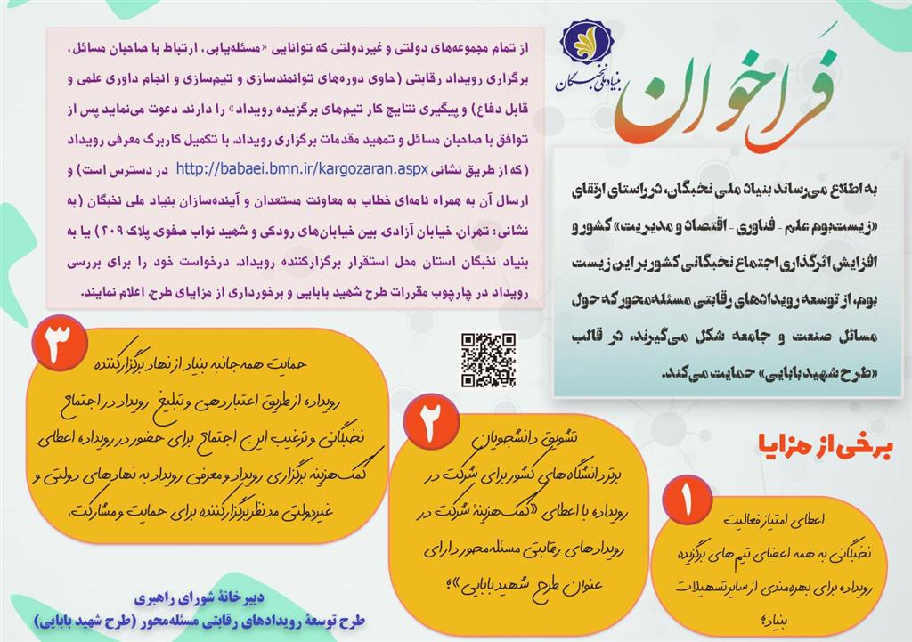 طرح توسعه رویدادهای رقابتی مسئله محور (طرح شهید بابایی) شیوه نامه طرح شهید بابایی کاربرگ معرفی رویداد تاریخ: 25 Oct 2023 تعداد بازدید: 3532 کپی
