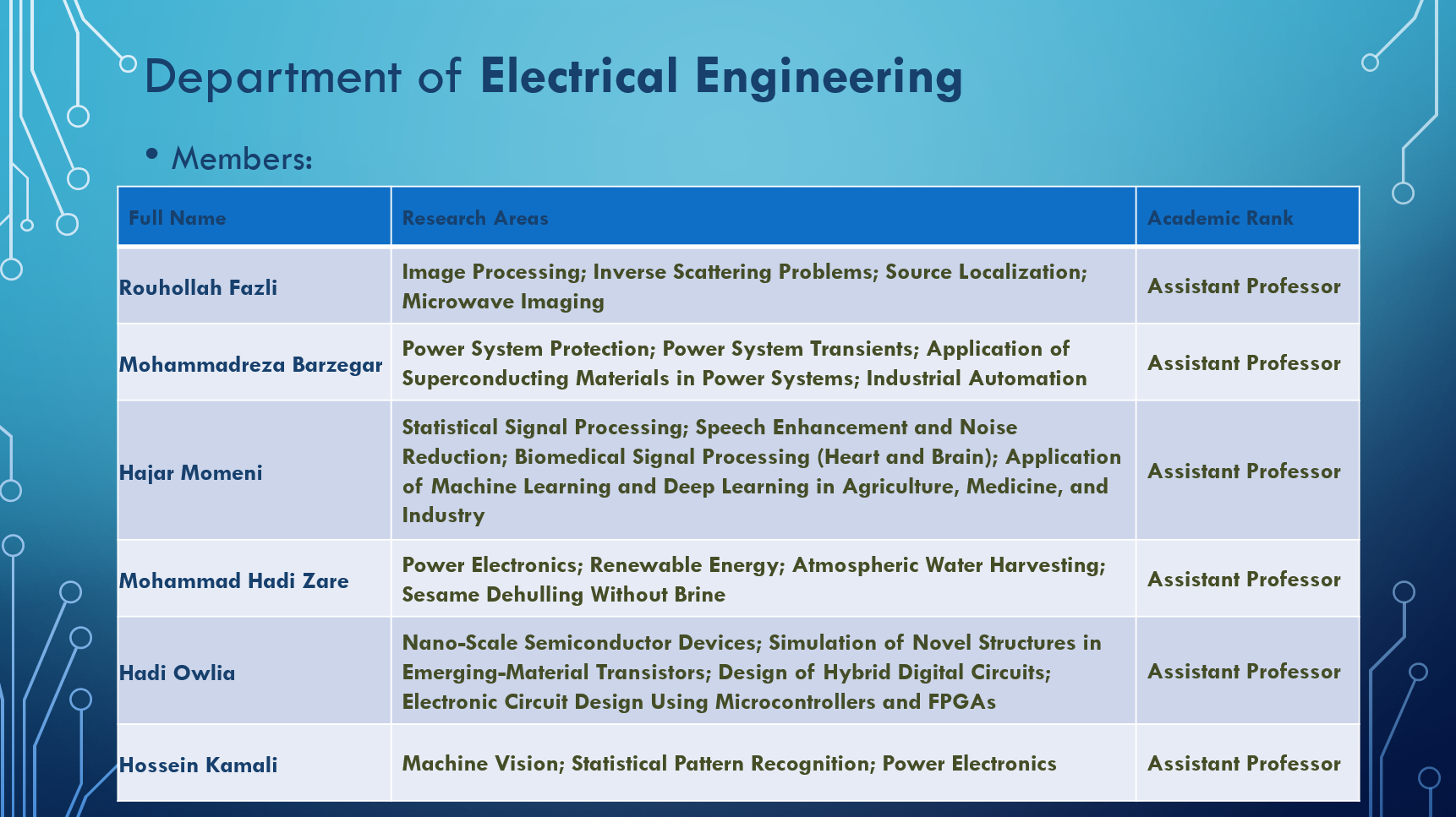 The main research activities of the faculty members currently focus on statistical signal processing, the application of various machine learning and deep learning methods for signal processing, vital signal processing and their applications in disease diagnosis and treatment, speech processing, image processing, semiconductor device simulation, power electronics, construction of various power supplies and their industrial applications, industrial automation, protection and relay systems, and more.