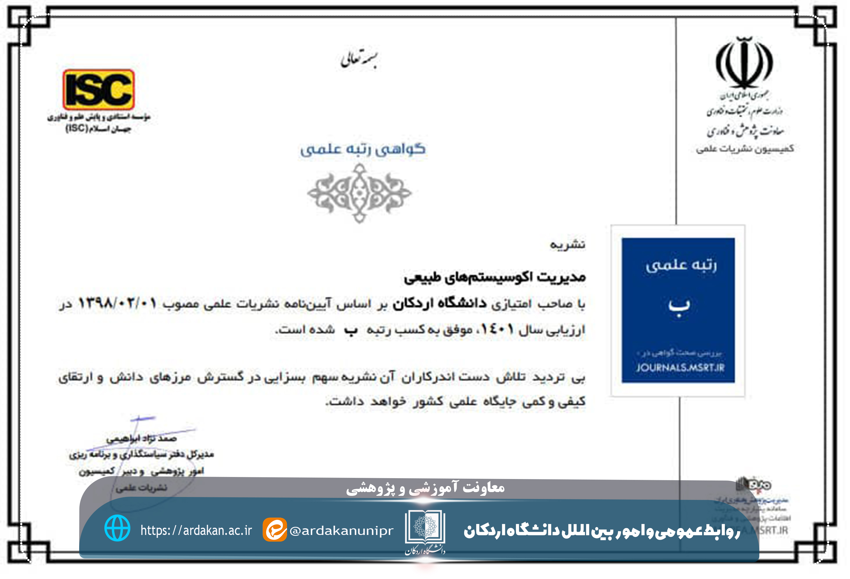 - اخذ مجوز نشریه علمی "مدیریت اکوسیستم‌های طبیعی" با رتبه "ب"
