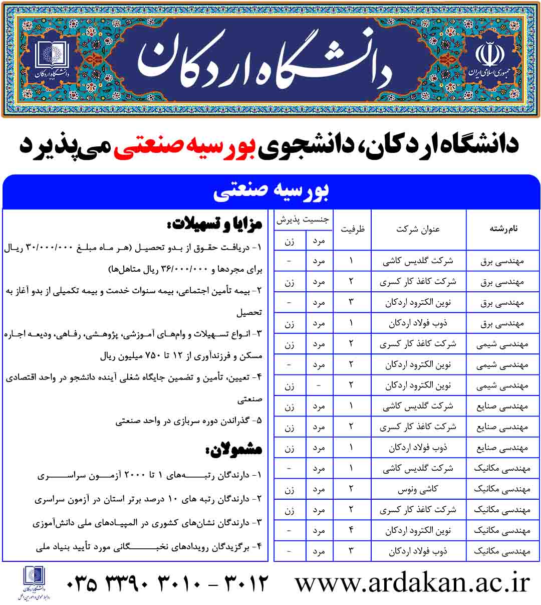 شرایط دانشگاه اردکان در پذیرش دانشجو بورسیه صنعتی