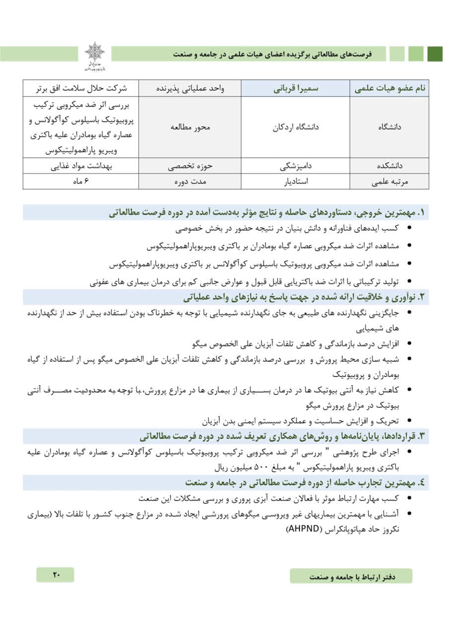In this collection, the research fellowship of Dr. Samira Ghorbani, a faculty member at the School of Veterinary Paramedicine, titled “Investigation of the Antimicrobial Effect of the Probiotic Bacillus coagulans Combination and Yarrow Plant Extract against Vibrio parahaemolyticus Bacteria,” has been introduced as a selected research fellowship.